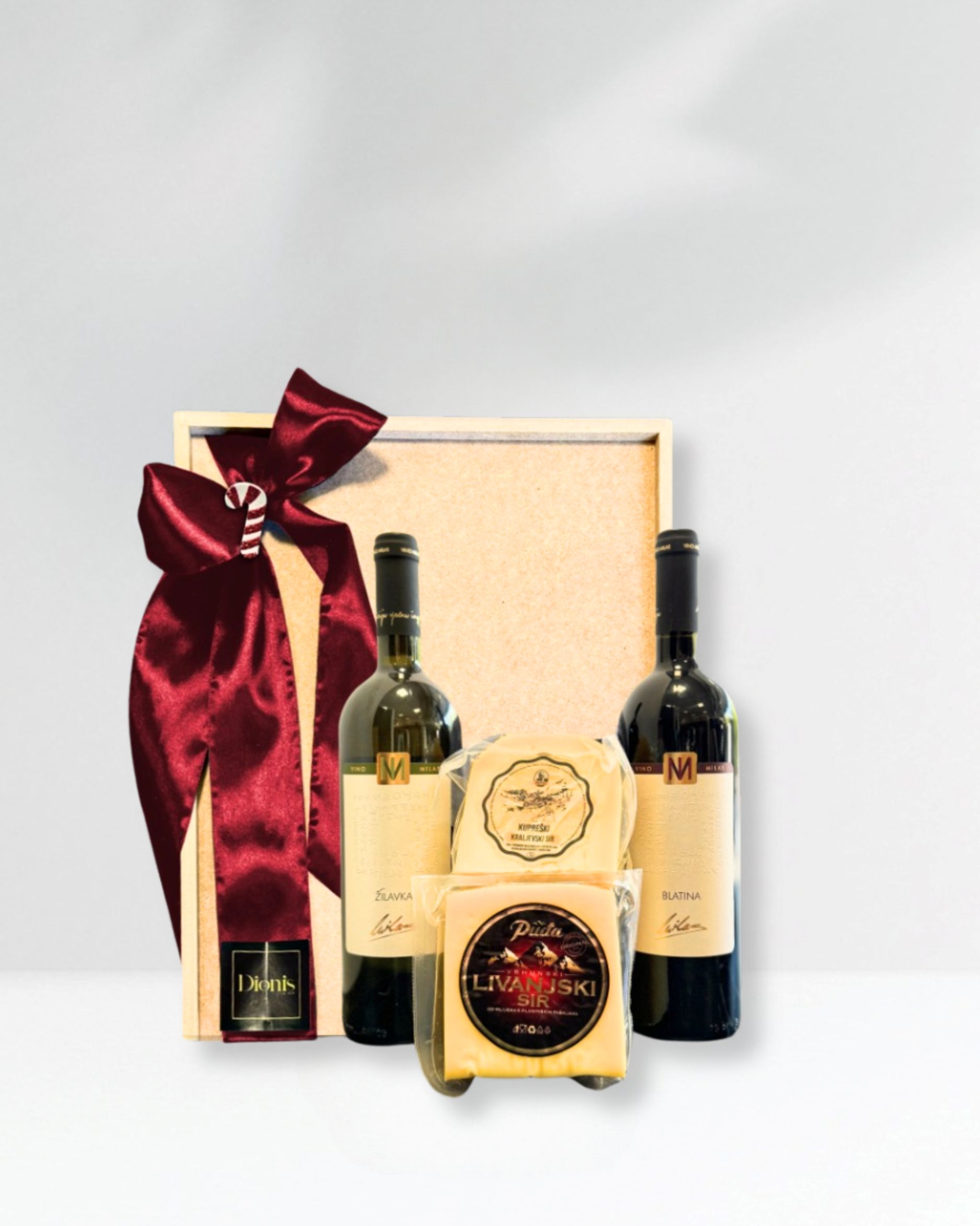 Poklon koji spaja tradiciju, eleganciju i užitak – idealan izbor za ljubitelje vina i domaćih sireva.