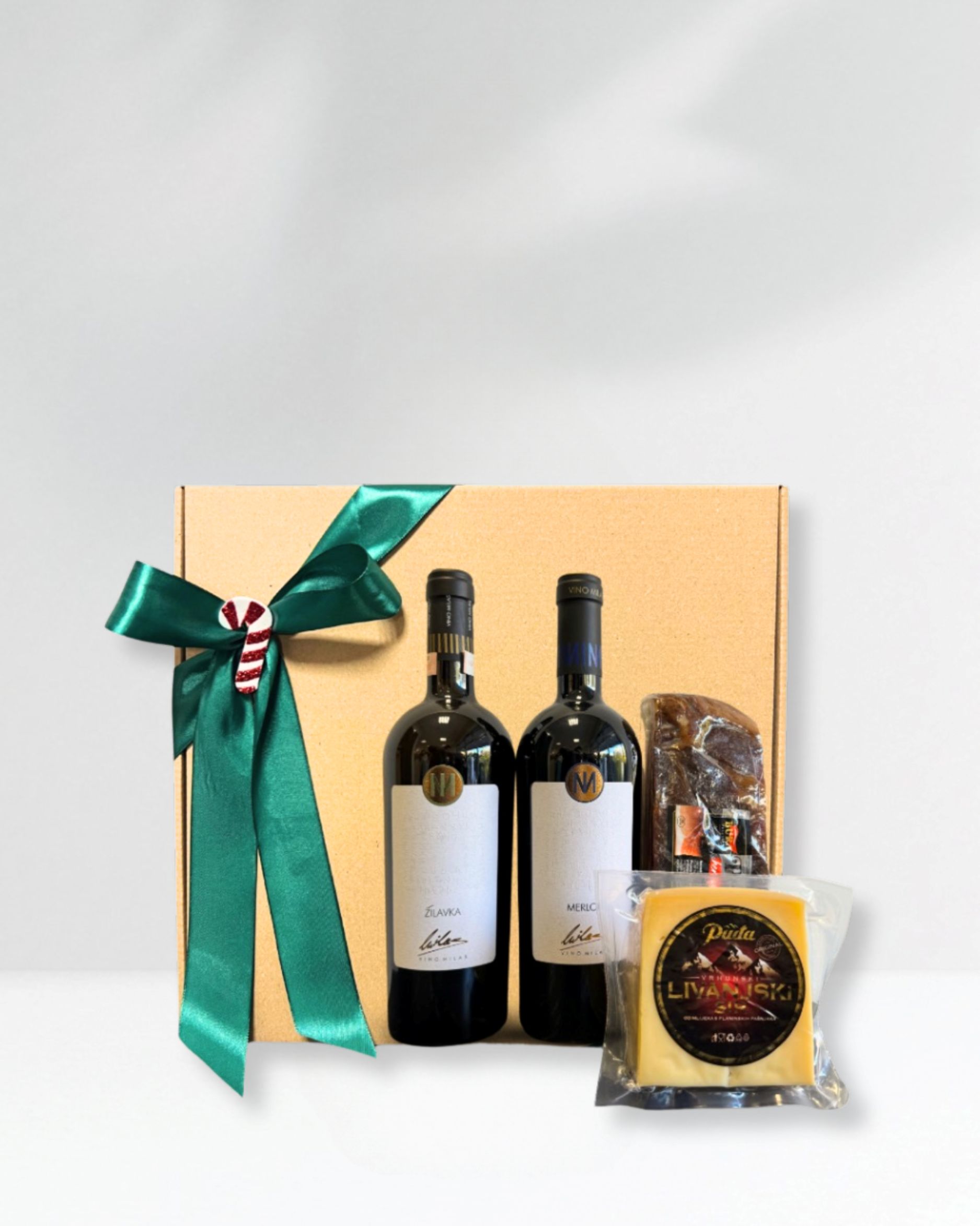 Poklon koji spaja tradiciju, eleganciju i vrhunski gurmanski užitak – idealan izbor za ljubitelje vina i domaćih specijaliteta.