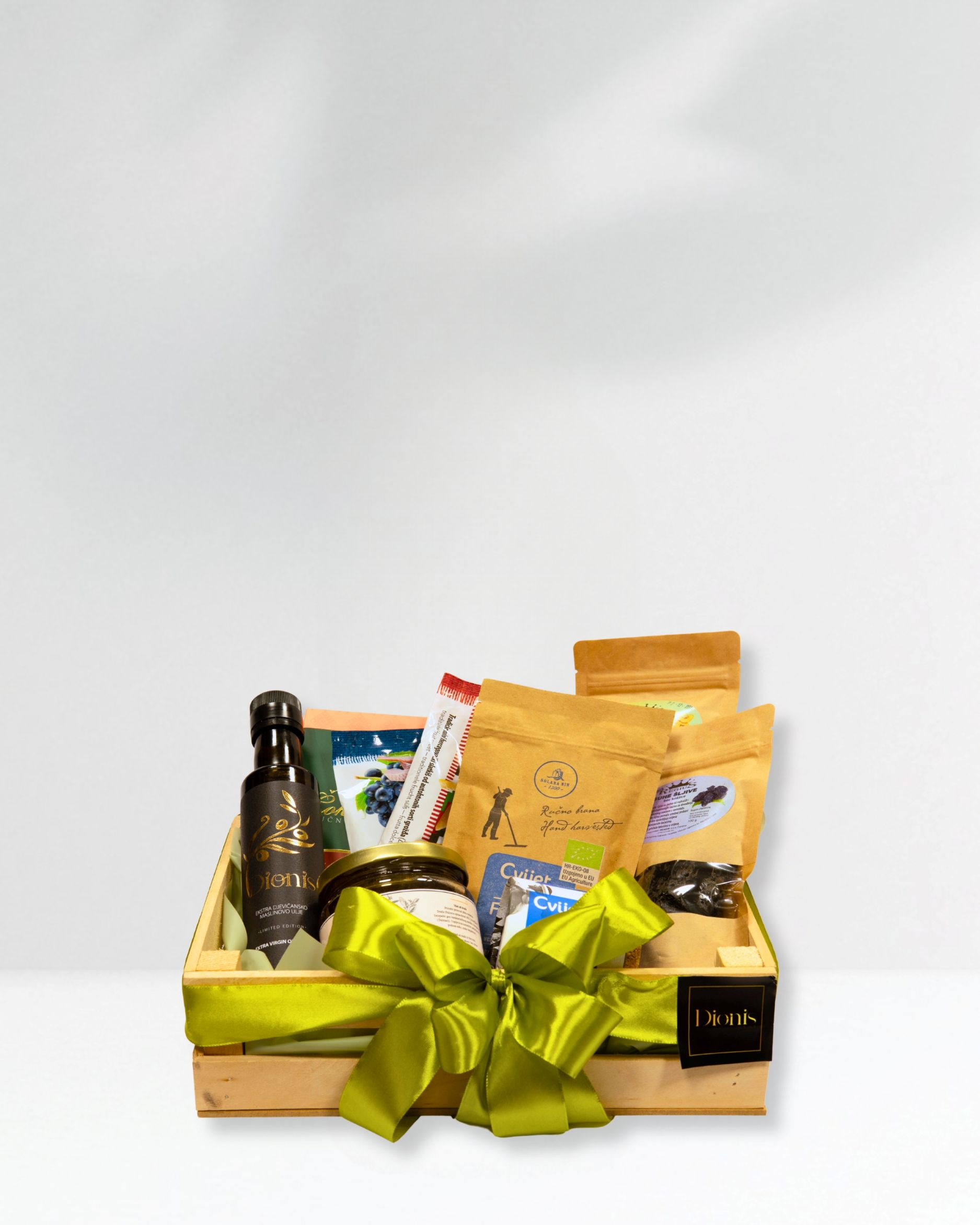 U elegantnoj drvenoj gajbi smješten je pažljivo odabran izbor domaćih proizvoda koji spajaju tradiciju, prirodnost i kvalitetu. Ovaj pomno sastavljen poklon paket sadrži Dionis ekstra djevičansko maslinovo ulje, ručno rađenu mliječnu čokoladu sa sjemenkama bundeve, crni i bijeli Ćupter, čips od jabuke, suhe šljive, suhe smokve, cvijet soli Nin, te Krešić med od livade 0,5 kg.