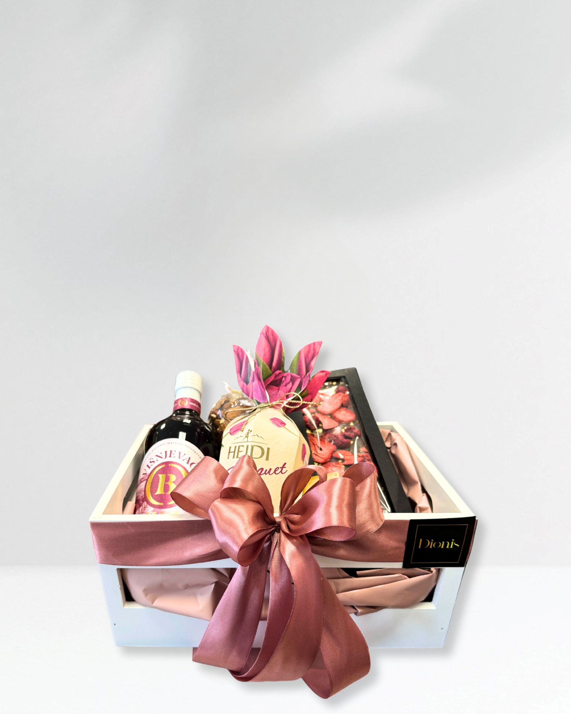 U elegantnoj bijeloj S drvenoj gajbi smješten je profinjen spoj domaćih okusa i luksuznih čokoladnih delicija. Ovaj pažljivo sastavljen poklon paket sadrži Begić višnjevaču – liker bogatog voćnog okusa, ChocoMe mliječnu čokoladu s liofiliziranim jagodama, malinama i 23-karatnim zlatom,, tuljak hrskavih badema, te Heidi Dark Bouquet praline – fine tamne praline punog i intenzivnog okusa.