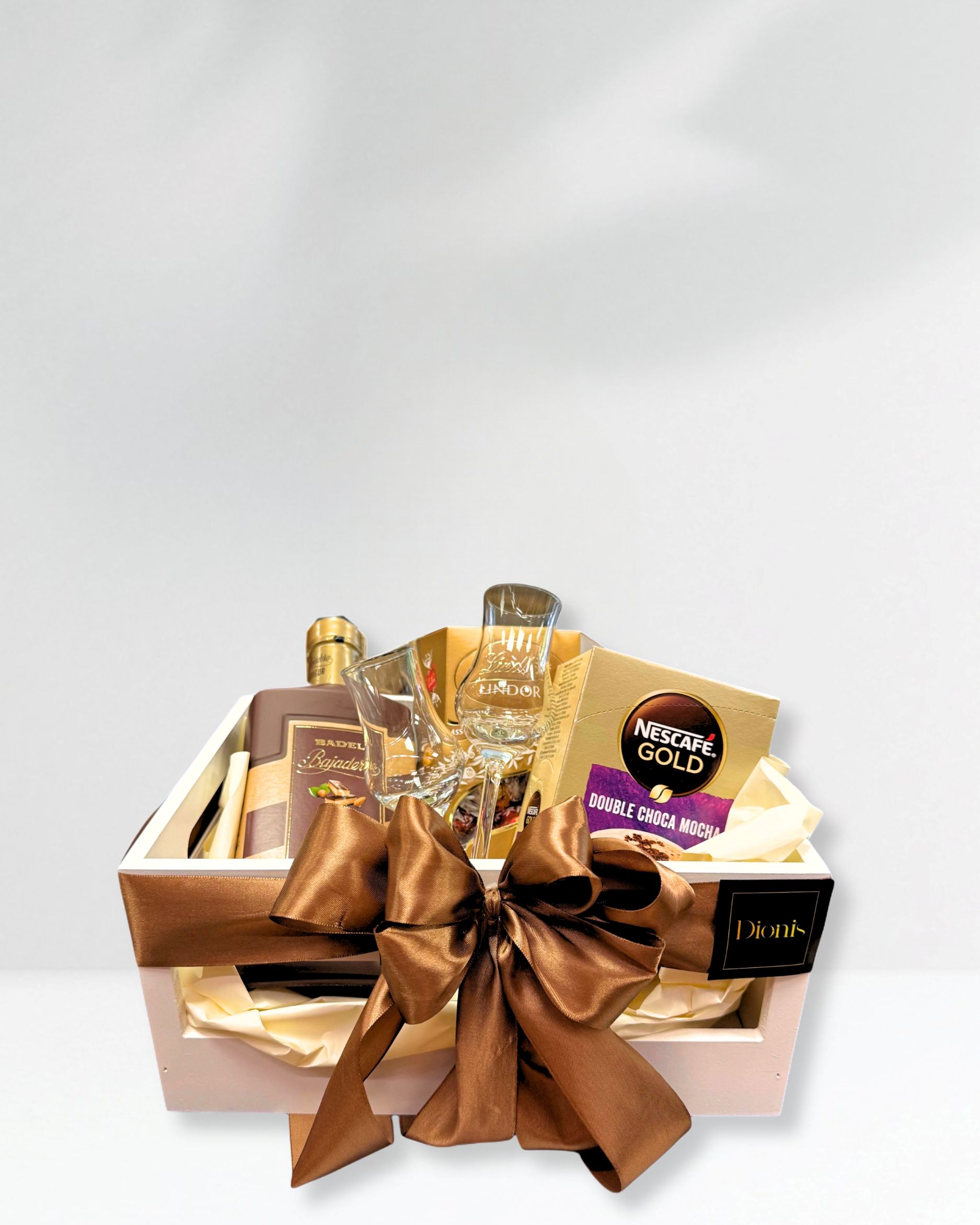 U elegantnoj bijeloj S drvenoj gajbi smješten je profinjen spoj aromatičnog likera i slatkih delicija. Ovaj pažljivo sastavljen poklon paket sadrži Badel Bajadera liker 0,7 L – kremasti liker inspiriran legendarnom čokoladnom bajaderom, Lindt Lindor Assorted praline – izbor najfinijih pralina s nježnim punjenjem, dvije elegantne čaše za rakiju na stalku, te Nescafé Cappuccino Chocolate – savršenu mješavinu kave i čokolade za trenutke užitka.