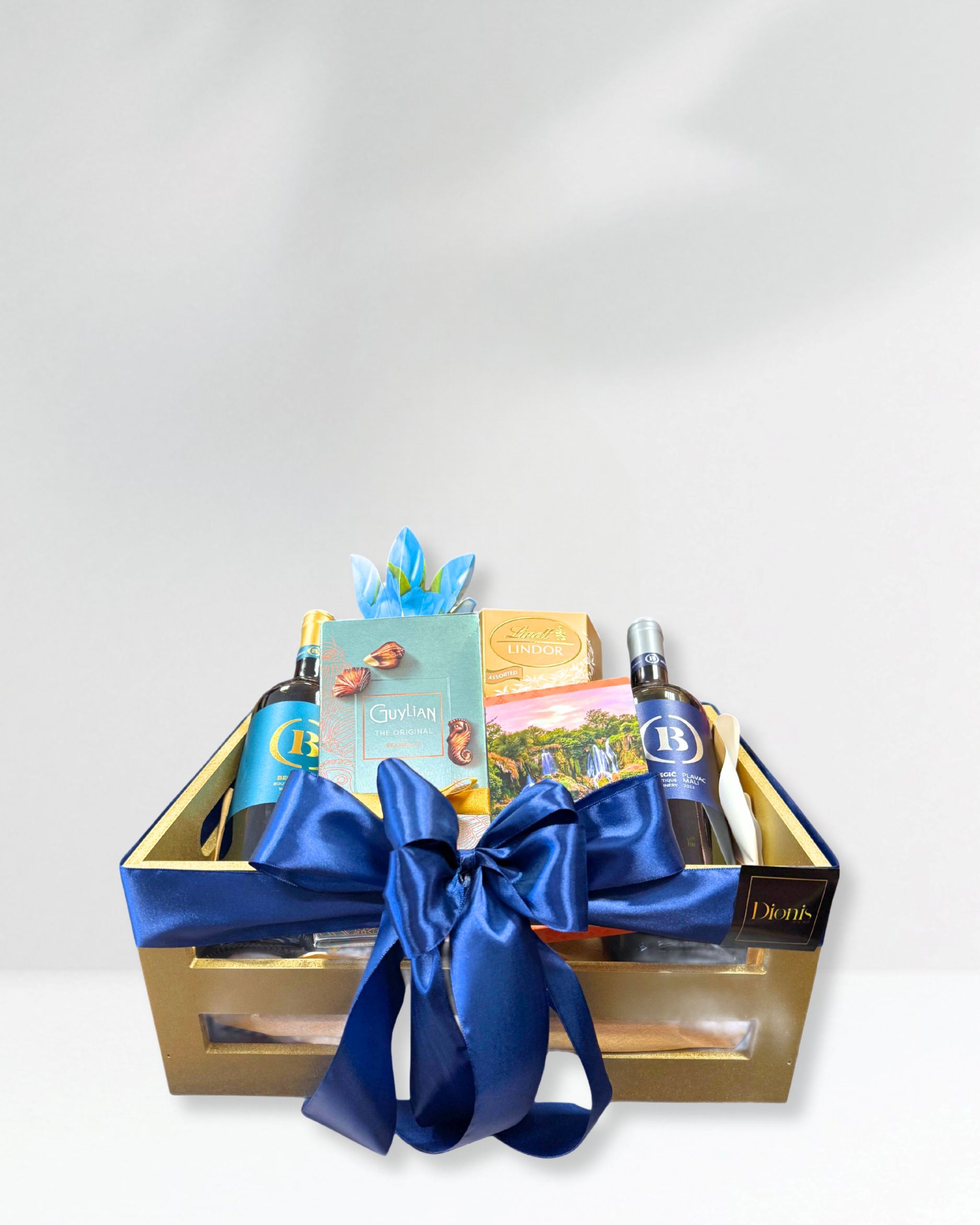 U profinjenoj zlatnoj M drvenoj gajbi nalazi se savršeno usklađen spoj vrhunskih vina i čokoladnih delicija. Ovaj pažljivo sastavljen poklon paket sadrži Begić Žilavku vrhunsko vino 0,75 L – elegantno bijelo vino svježine i punog okusa, te Begić Plavac Mali vrhunsko vino 0,75 L – bogato crveno vino snažnog karaktera i aromatičnih nota dalmatinskog juga.